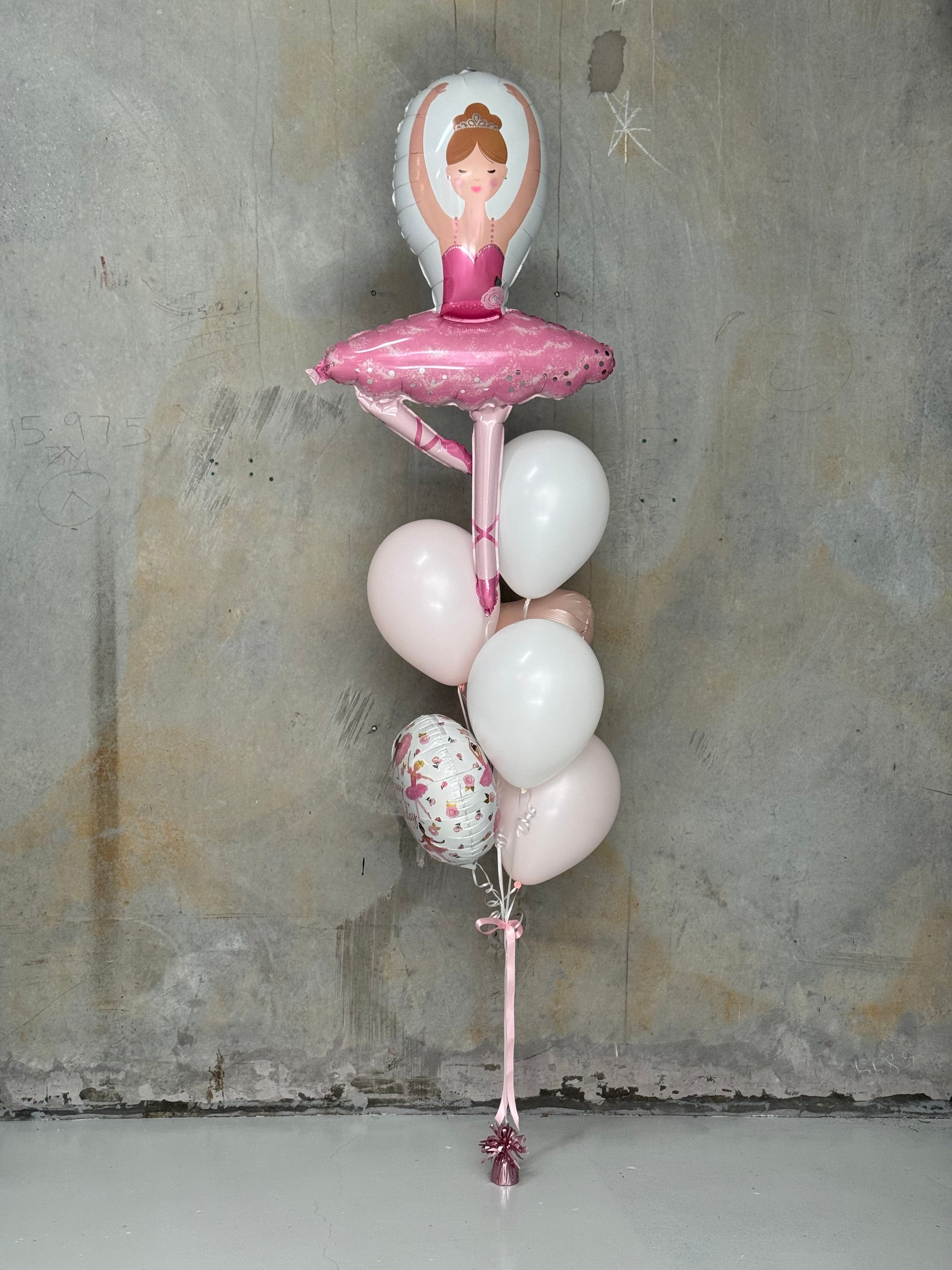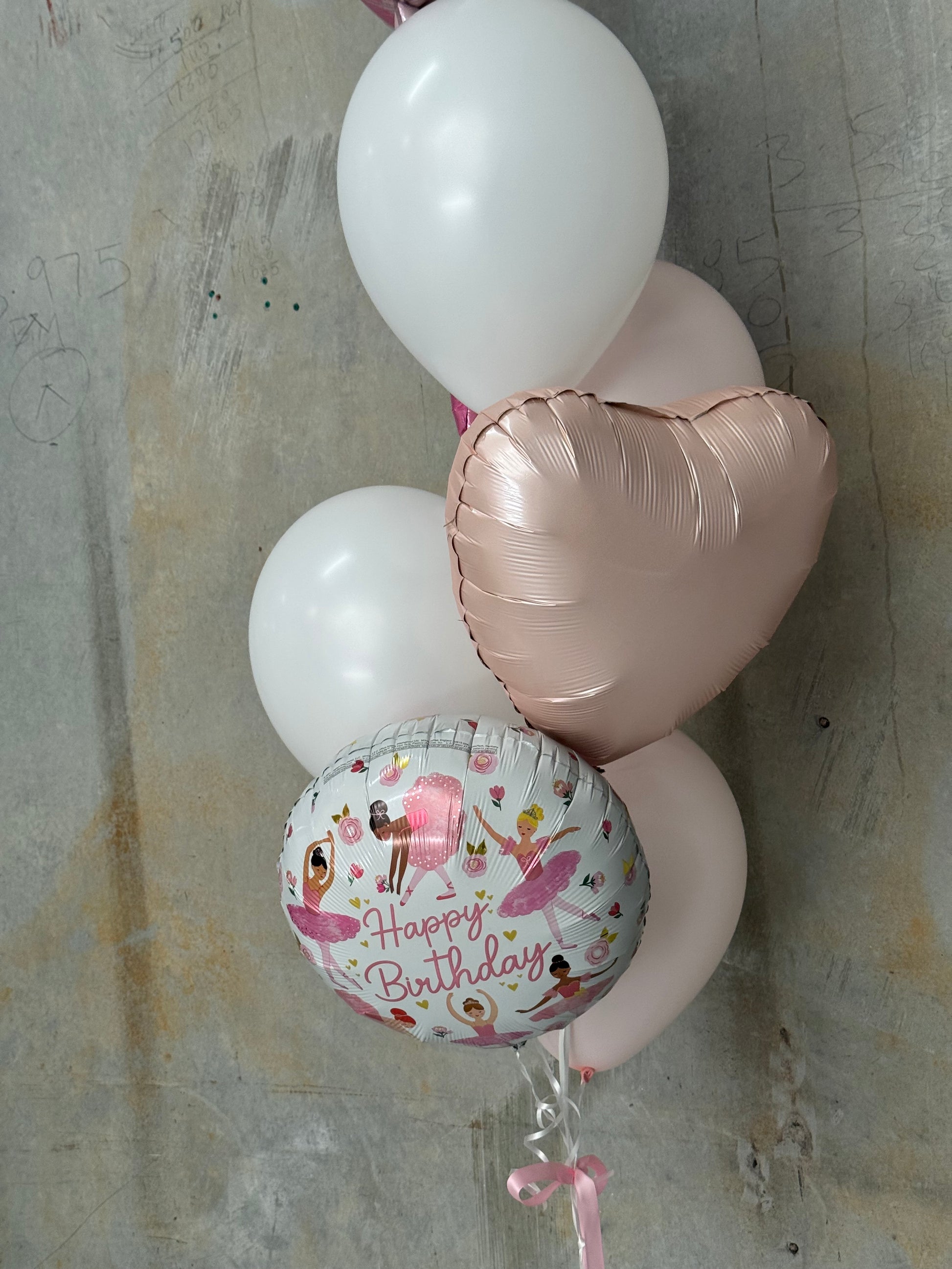 Celebrate in style with the Ballet Bliss bouquet, featuring a large foil ballet dancer centerpiece that adds elegance to any occasion. Complemented by four vibrant latex balloons, a charming foil heart, and a festive foil "Happy Birthday" balloon, this arrangement combines sophistication with celebration. Perfect for dance enthusiasts and birthday celebrations alike, it delivers a graceful and joyful atmosphere effortlessly.