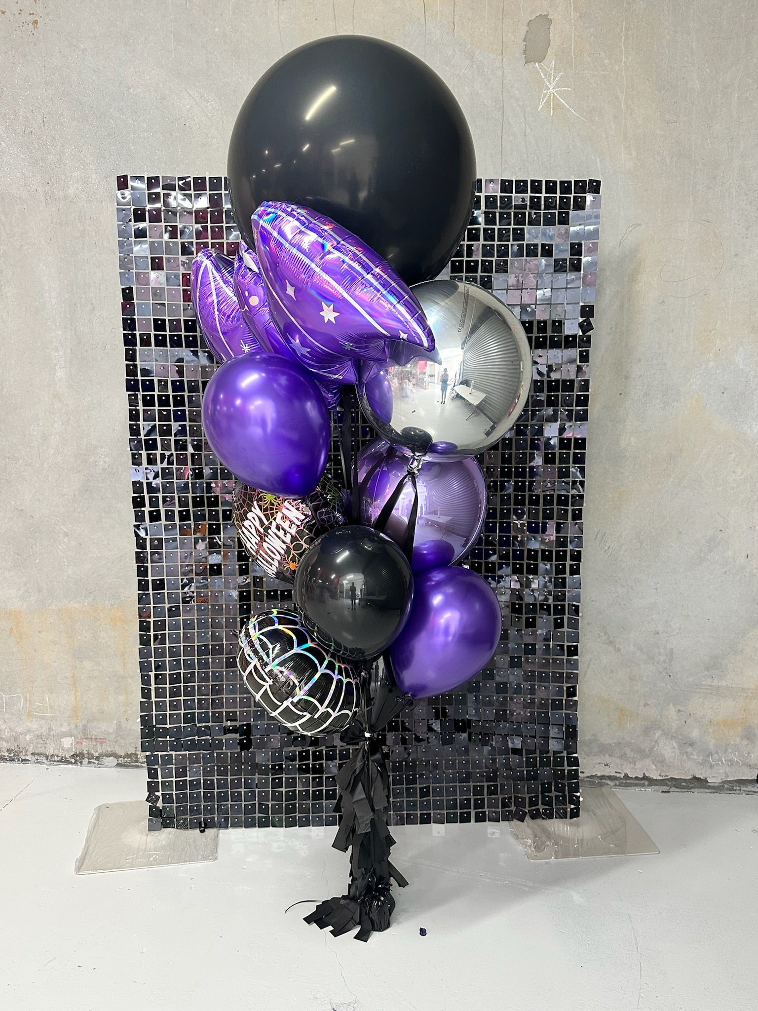 Bring some spooky sparkle to your celebration with our Purple & Black Halloween Balloon Bouquet! This eye-catching cluster features a bold mix of deep purples, glossy blacks, and chrome silvers — the perfect blend of eerie and elegant.