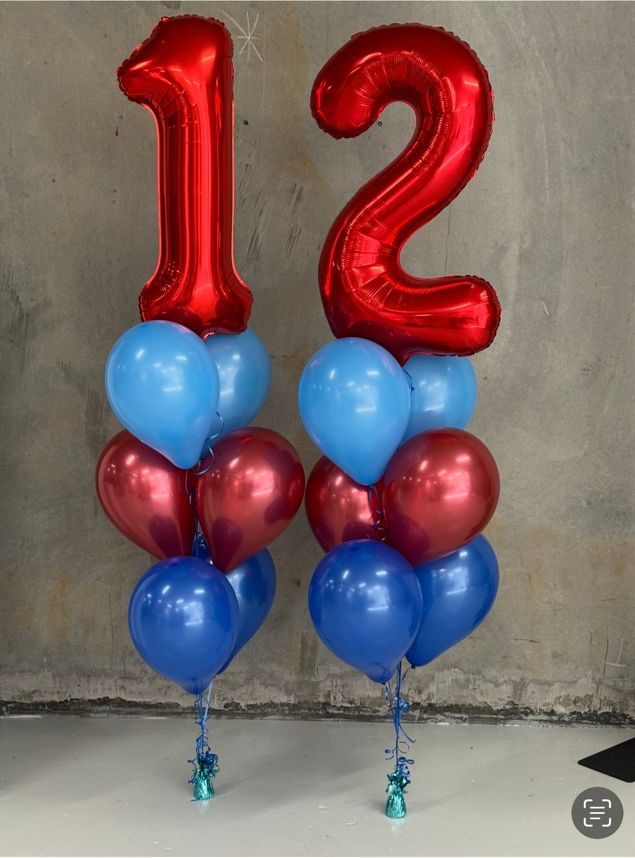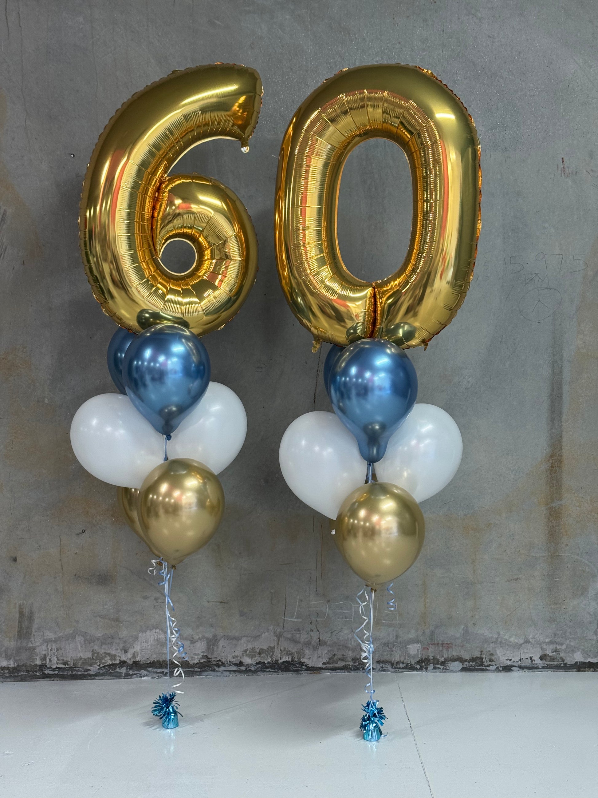 Create an eye-catching celebration with our Double Number Bouquets. Two shiny foil helium numbers are paired with 6 latex balloons each, all beautifully arranged on separate balloon weights. Perfect for adding a touch of elegance to birthdays, anniversaries, and more!
