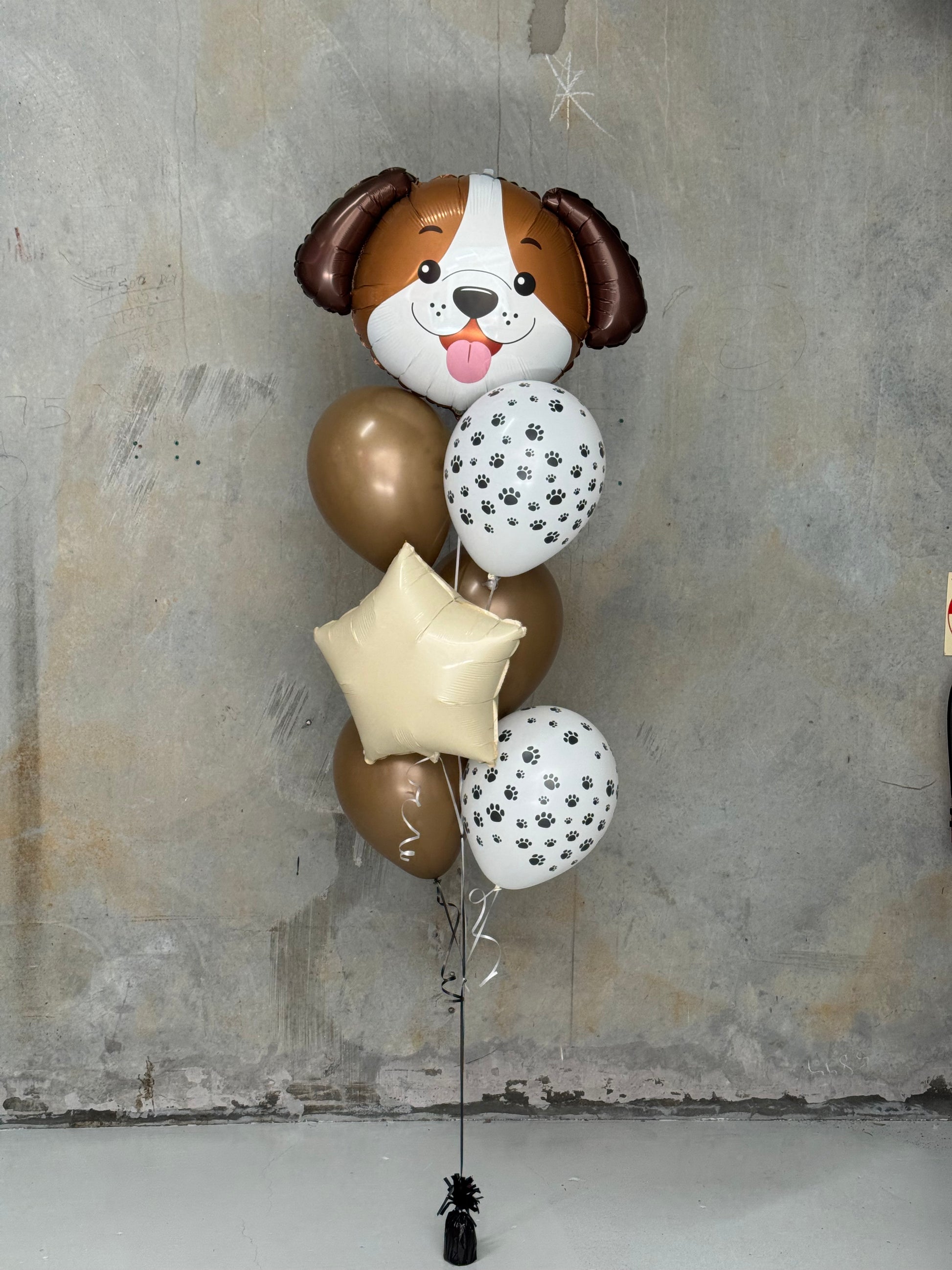 This charming balloon bouquet features a playful foil dog balloon, complemented by five vibrant latex balloons and a shiny foil star. Perfect for adding a touch of whimsy and celebration to any occasion, the carefully selected mix balances fun and elegance effortlessly.